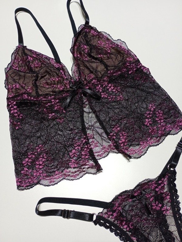 Top forrado en el busto, de hermoso encaje combinado negro con rosa (Edicion limitada), con arco.
