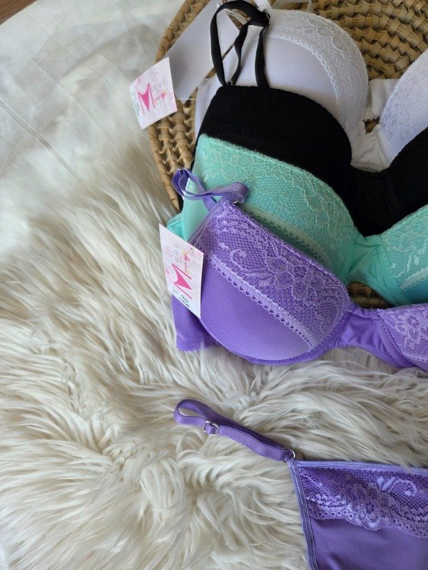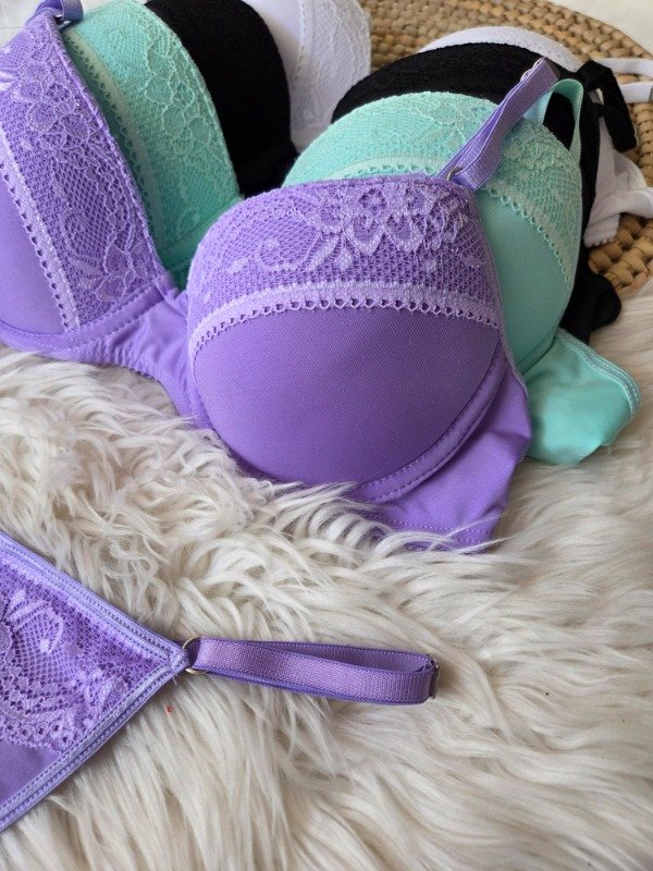 Conjunto armado: taza soft con arco y push up. Tela de lycra con detalles de encaje.