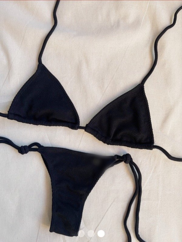 Corpiño triangulo de morley grueso. Tiras para atar. Forrada tanto el corpiño como la bombacha.