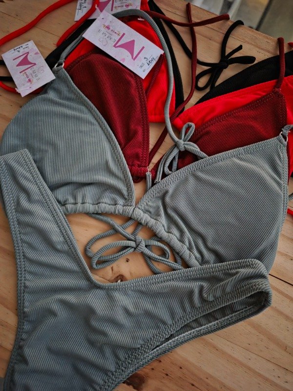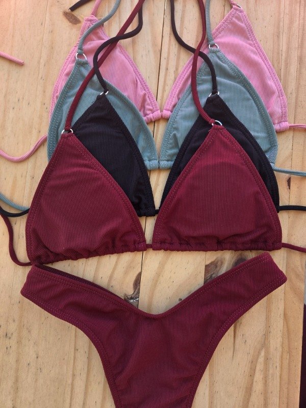 Corpiño triangulito trae tiras en el cuello y en el contorno.