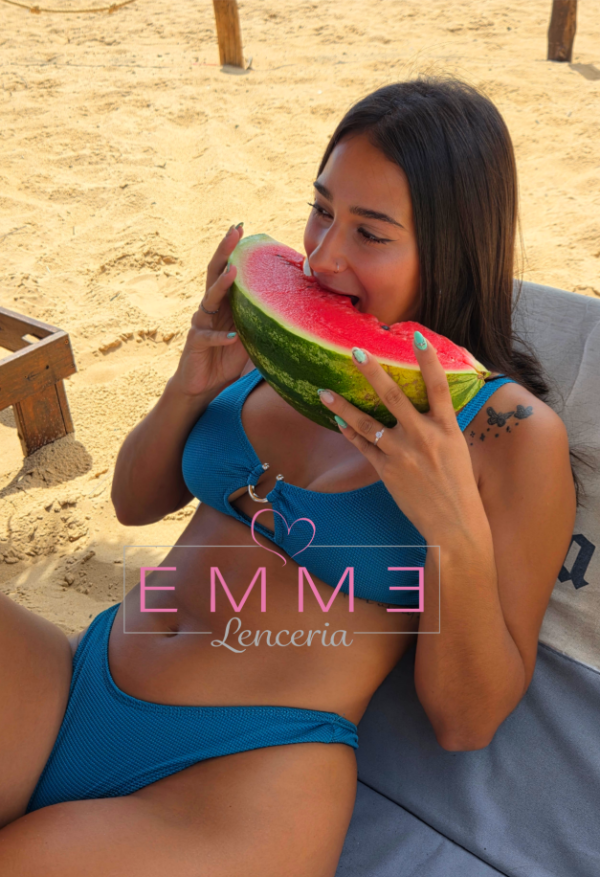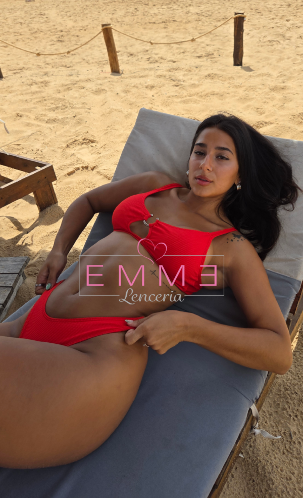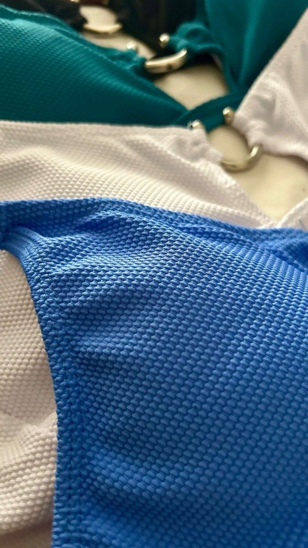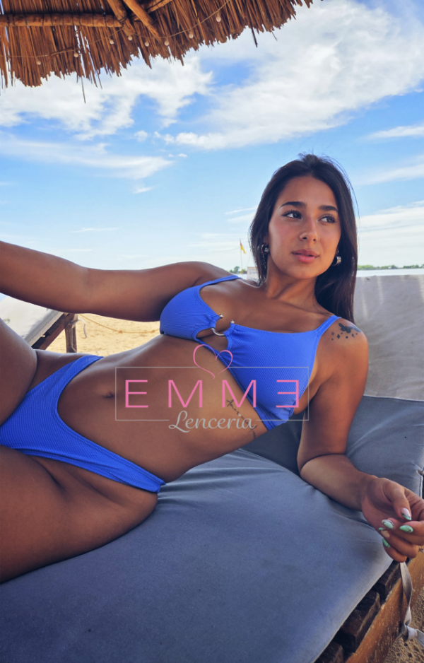 Corpiño con detalle de media argolla en forma de U. Los breteles son regulables. La espalda se ata.